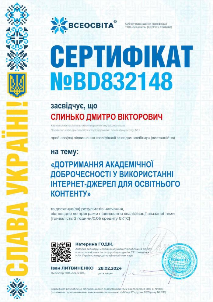 Професор кафедри теорії та історії держави і права факультету № 1 ХНУВС Дмитро Слинько взяв участь у вебінарі «Дотримання академічної доброчесності у використанні інтернет-джерел для освітнього контенту», що відбувся на національній освітній платформі «Всеосвіта».