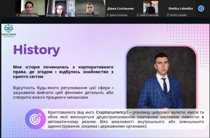 Для слухачів магістратури, які навчаються за спеціальністю «Фінанси, банківська справа та страхування», та студентів-бакалаврів за спеціальністю «Право» факультету № 6 проведено бінарне заняття на тему «Професія юриста, що спеціалізується на криптовалютному регулюванні». Заняття провели старший юрист юридичної компанії INSEININ Роман Дулюк спільно з доценткою кафедри правового забезпечення підприємницької діяльності та фінансової безпеки факультету № 6 Іриною Антол і професоркою кафедри Юлією Кириченко.