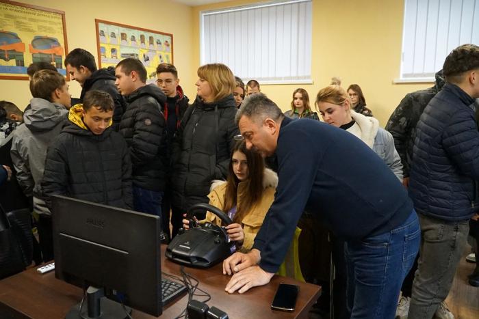 Керівник Автошколи Олександр Марунчак розповів старшокласникам, у яких рідні чи близькі є учасниками бойових дій та отримали інвалідність, що в Автошколі для осіб з інвалідністю ХНУВС можна пройти навчання та отримати посвідчення водія категорії «В». Учням також надали можливість випробувати себе на тренажерах в аудиторії Автошколи.