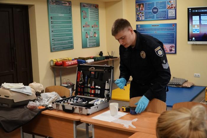 Завідувач кафедри криміналістики, судової експертології та домедичної підготовки Василь Корнієнко розповів про роботу криміналіста, а курсанти продемонстрували навички надання першої невідкладної домедичної допомоги, способи зупинки критичної кровотечі та проведення серцево-легеневої реанімації.