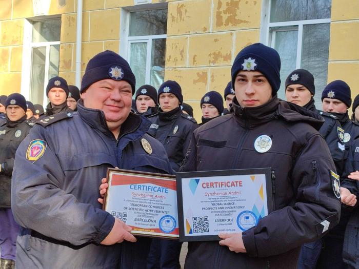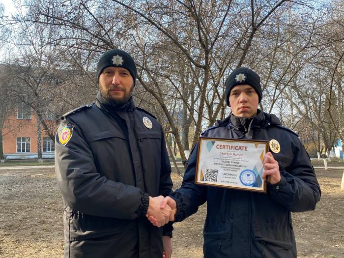 Декан факультету № 4 Микола Марчук і заступник декана Юрій Онищенко вручили курсантам – Андрію Синжеряну, Роману Стецюку, Івану Цуркану та Іллі Желновачу сертифікати за участь у VII Міжнародній науково-практичній конференції «GLOBAL SCIENCE: PROSPECTS AND INNOVATIONS» у м. Ліверпуль (Великобританія) та м. Барселона (Іспанія). Вони побажали юнакам подальших успіхів у науковій роботі та службі.