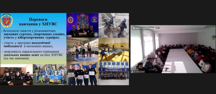Випускникам коледжу у презентаційному форматі було докладно надано інформацію про факультети та спеціальності університету, за якими здійснюється підготовка фахівців, про умови навчання та проживання курсантів, про роботу наукових гуртків, спортивних секцій. Юрій Онищенко навів покроковий алгоритм дій абітурієнта при вступі до Харківського національного університету внутрішніх справ і підкреслив, що для того, щоб навчатися у закладах вищої освіти зі специфічними умовами навчання, де готують поліцейських, перш за все необхідно заповнити анкету на порталі Національної поліції: https://osvita.np.gov.ua/.