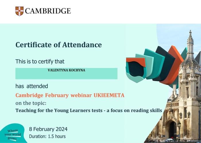 Науково-педагогічний склад кафедри іноземних мов факультету № 4 – завідувачка кафедри Олена Статівка, доценти Олег Гончарук, Валентина Кочина, Валентина Почуєва та старші викладачі Артем Білоусов і Лариса Сазанова – відвідали міжнародний вебінар «Teaching for the Young Learners tests – a focus on reading skills» від Cambridge English. Учасники заходу розглянули такі питання: як розвивати навички читання, щоб підготуватися до складання іспиту Cambridge Exam будь-якого рівня – від Pre A1 Starters до C2 Proficiency; чому фокусування важливе під час навчання читанню; як спланувати фокусування. Викладачі також отримали поради щодо використання освітніх ресурсів.