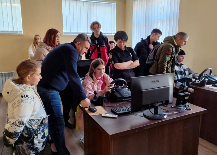 Діти відвідали клас автомобільної підготовки і спеціалізовану навчальну аудиторію. Керівник Автошколи Олександр Марунчак розповів школярам, у яких рідні чи близькі є учасниками бойових дій та отримали інвалідність, що в Автошколі для осіб з інвалідністю ХНУВС можна пройти навчання та отримати посвідчення водія категорії «В». Учням також надали можливість випробувати себе на тренажерах в аудиторії Автошколи.