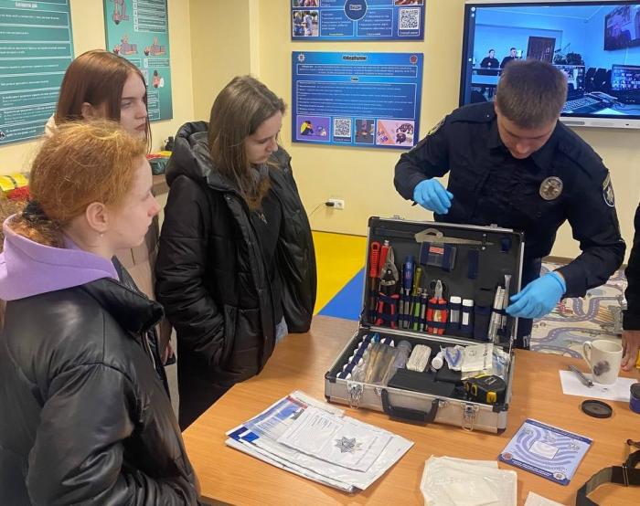 Члени наукового гуртка кафедри тактичної та спеціальної підготовки ознайомили учнів із макетами різних видів зброї, вибухонебезпечних предметів і боєприпасів, а також екіпіруванням поліцейського під час виконання спеціальних завдань. Курсанти також продемонстрували навички надання першої невідкладної домедичної допомоги, способи зупинки критичної кровотечі та проведення серцево-легеневої реанімації.