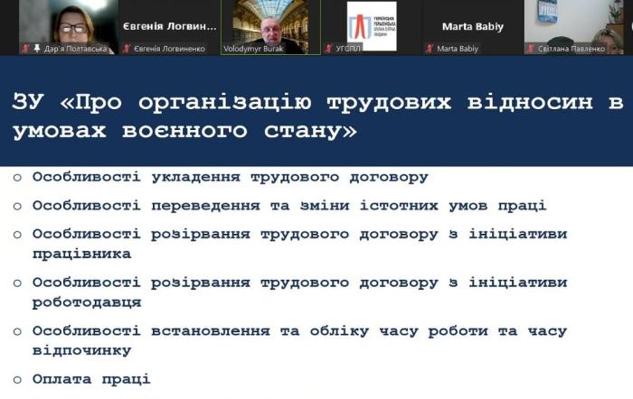 Під час заходу були розглянуті питання щодо організації трудових відносин в умовах воєнного стану, а саме: укладення трудового договору за сумісництвом, законодавчі обмеження для сумісників, режим роботи, оплата праці та соціальне забезпечення.