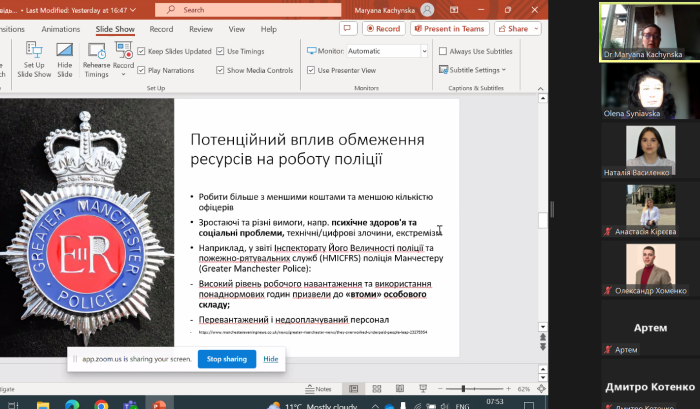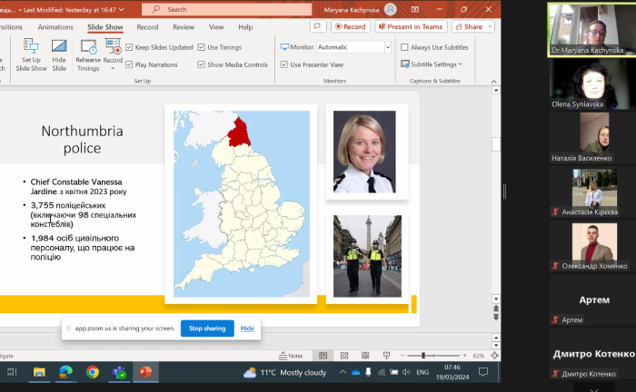 Викладачка поліціїстики та кримінології кафедри соціальних наук Нортумбрійського університету у Нькасл апон Тайн (Сполучене Королівство), кандидатка юридичних наук, доцентка Мар'яна Качинська спільно з професоркою кафедри правоохоронної діяльності та поліціїстики факультету № 6, докторкою юридичних наук, професоркою Оленою Синявською провели лекційне бінарне заняття за темою «Деякі аспекти роботи поліції та підготовки поліцейських у Англії та Уельсі» для магістрів 1 курсу, які навчаються за освітньо-професійною програмою «Правоохоронна діяльність».