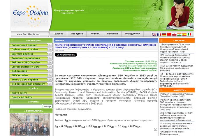Харківський національний університет внутрішніх справ за рейтингом, опублікованим на порталі «Євро Освіта», увійшов до двадцятки найефективніших вишів України за результатами участі у головних міжнародних і вітчизняних конкурсах наукових проєктів у 2023 році. Цей показник є одним із найголовніших для сучасних закладів вищої освіти. Окрім ХНУВС до рейтингу потрапили іще чотири харківських університети. Так тримати!