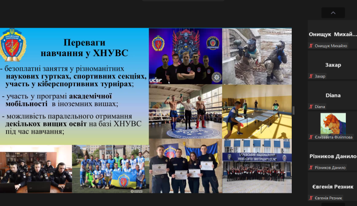 Під час зустрічі Юрій Онищенко у презентаційному форматі докладно розповів про перспективи навчання в університеті, надав інформацію про факультети та спеціальності, за якими здійснюється підготовка фахівців, про умови навчання і проживання курсантів, спортивні секції, наукові гуртки тощо. Він надав покроковий алгоритм дій абітурієнта під час вступу у заклади вищої освіти системи МВС.
