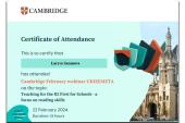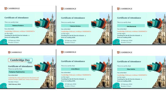 Завідувачка кафедри іноземних мов факультету № 4 ХНУВС Олена Статівка, доценти цієї ж кафедри Олег Гончарук, Валентина Кочина, Валентина Почуєва, старші викладачі Артем Білoусов, Тетяна Кальченко і Лариса Сазанова взяли участь у Міжнародному онлайн-вебінарі «Teaching for the B 2 First for Schools – a focus on reading skills» із серії вебінарів Cambridge February 2024 – Webinar UKIEEMETA з Darren Perrett. Викладачі кафедри ознайомилися з когнітивними процесами, необхідними студентам, щоб відповідати на запитання B2 First Reading порівняно з нижчими критеріями Загальноєвропейських компетенцій володіння іноземною мовою (CEFR), а також із різними підходами до читання з використанням додаткових ресурсів Cambridge English та порадами щодо того, як найкраще максимізувати потенціал студентів.