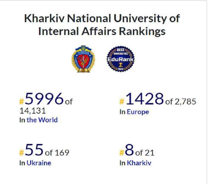 Харківський національний університет внутрішніх справ, піднявшись на шість сходинок вище, посів 55 місце серед 169 ЗВО. ХНУВС єдиний з усіх закладів вищої освіти МВС, який увійшов до 100 найкращих університетів України.