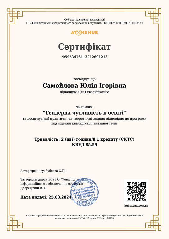 Доцентка кафедри гуманітарних дисциплін Сумської філії ХНУВС Юлія Самойлова успішно пройшла програму підвищення кваліфікації «Гендерна чутливість в освіті». Учасники вебінару ознайомилися з основними законодавчими актами, які регулюють питання гендерної рівності, положеннями і сутністю ґендерного підходу, сучасними тенденціями і проблемами гендерного розвитку суспільства, формами і методами гендерного виховання. Вони набули вміння розпізнавати гендерні аспекти та проблеми в освітній сфері, а також дізналися як знаходити рішення для їх оптимального розв’язання.