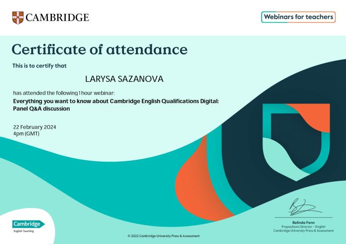 Завідувачка кафедри іноземних мов факультету № 4 ХНУВС Олена Статівка, доценти цієї ж кафедри Олег Гончарук, Валентина Кочина, Валентина Почуєва, старші викладачі Артем Білoусов і Лариса Сазанова взяли участь у Міжнародному онлайн-вебінарі «Everything you want to know about Cambridge English Qualifications Digital Panel Q & A discussion» від Сambridge English Teaching. На заході розглянуто складання цифрового іспиту з англійської мови як швидкого і гнучкого способу отримати кваліфікацію Cambridge English. Викладачі кафедри дізналися про досвід складання та зміст іспиту, доступні підготовчі матеріали та поради експертів щодо створення атмосфери, щоб почувати себе впевнено перед іспитом.