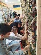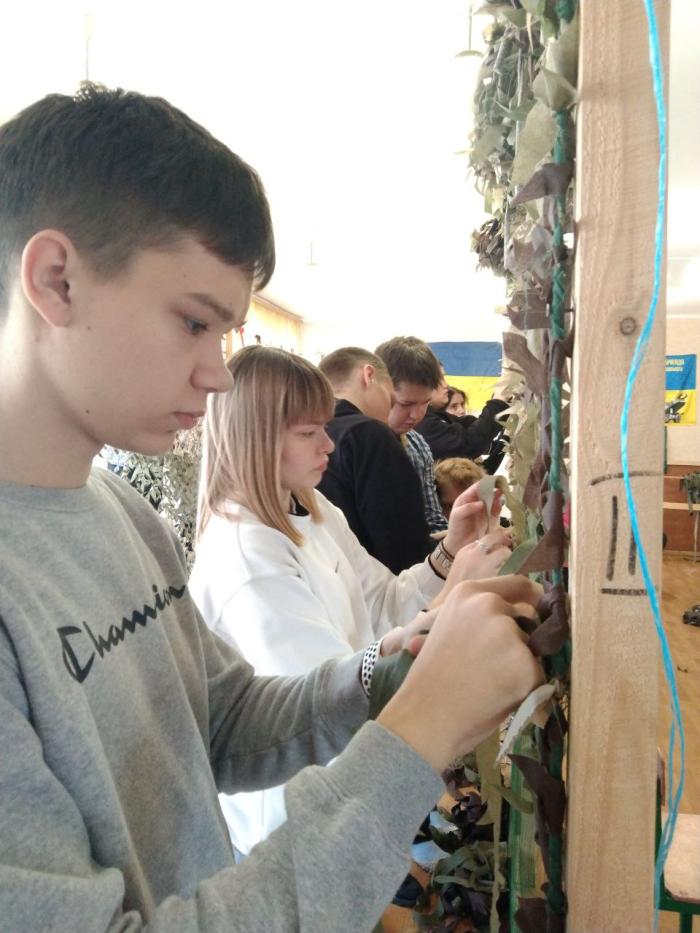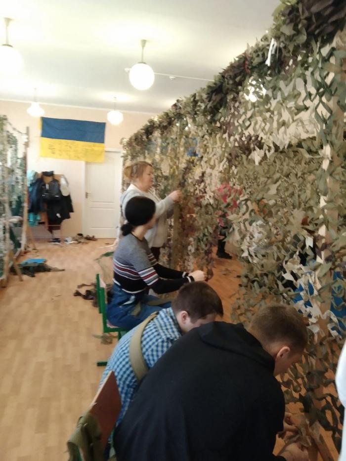 Курсанти другого курсу Сумської філії Харківського національного університету внутрішніх справ Дмитро Крупецьких, Володимир Корж, Кирило Малофєєв, Поліна Левченко, Олександр Овчаров і Катерина Пономаренко разом із провідною фахівчинею відділення кадрового забезпечення Ганною Мітітєл долучилися до роботи волонтерського центру «Моторний вулик». Вони сплели маскувальну сітку розміром 6 х 8 метрів, яка стане захистом для наших військових.