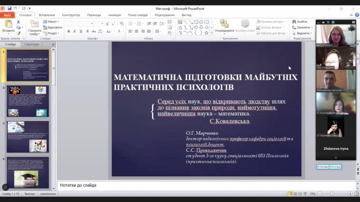 Учасники засідання прослухали і обговорили наукові доповіді студентів та студенток: Святослав Прокодянчик виступив на тему «Математична підготовка майбутніх практичних психологів», Руслана Мілько – «Формування менеджерської компетентності здобувачів вищої освіти у процесі студентського самоврядування», Аліни Охріменко – «Психологічні умови подолання стресу серед студентської молоді».