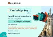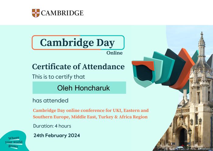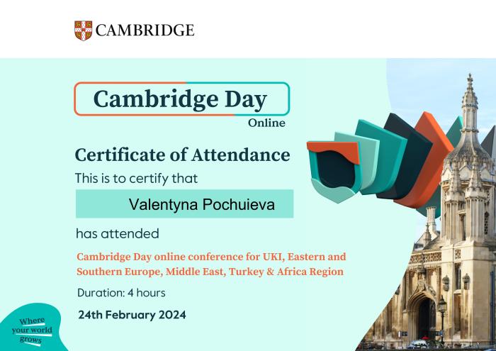 Завідувачка кафедри іноземних мов факультету № 4 ХНУВС Олена Статівка, доценти цієї ж кафедри Олександр Левашов, Олег Гончарук, Валентина Кочина, Валентина Почуєва, старші викладачі Артем Білoусов і Лариса Сазанова взяли участь у 4-годинній Міжнародній онлайн-конференції «Cambridge Day online conference for UKI, Eastern and Southern Europe, Middle East, Turkey & Africa Region», організованій і проведеній спікерами Cambridge English Teaching.