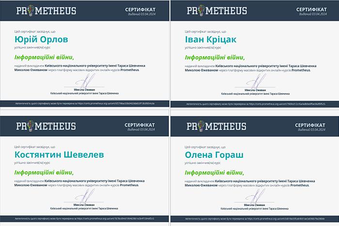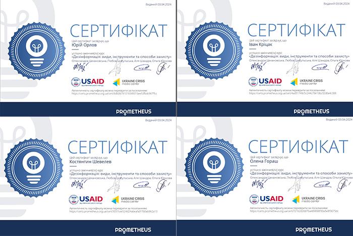 Науково-педагогічні працівники кафедри кримінального права і кримінології факультету № 1 – завідувач кафедри Юрій Орлов, доцент кафедри Іван Кріцак, старший викладач кафедри Костянтин Шевелев та викладачка кафедри Олена Гораш – пройшли цикл короткострокових курсів підвищення кваліфікації, спрямованих на формування "soft skills" у сфері протидії фейкам та дезінформації. Відсіч російській агресії в інформаційному просторі, вчасне розпізнавання, блокування дезінформації, спроб маніпуляції масовою свідомістю – важливі завдання правоохоронного й безпекового значення. Отримані знання будуть вмонтовані в освітній процес під час викладання курсів «Кримінальне право», «Кримінологія», «Аналіз та прогнозування злочинності», «Актуальні проблеми протидії злочинності».
