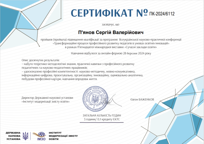 За результатами роботи конференції, організаторами якої виступили Державна наукова установа «Інститут модернізації змісту освіти» і Громадська організація «UkraineActive», учасники отримали сертифікати підвищення кваліфікації.