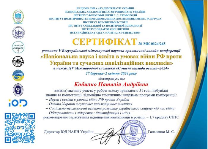 Доцентка кафедри соціально-гуманітарних дисциплін, кандидатка філологічних наук Наталія Кобилко долучилася до роботи V Всеукраїнської міжгалузевої науково-практичної онлайн-конференції «Національна наука і освіта в умовах війни РФ проти України та сучасних цивілізаційних викликів». Формат заходу передбачав пленарні засідання та секційні онлайн-доповіді. Учасники обговорили нагальні проблеми розвитку українського суспільства, дотримання принципів свободи, рівності, поваги до людської гідності. Особливу увагу доповідачі акцентували на умовах розвитку освіти й науки під час війни, запроваджених заходах із метою оптимізації та покращення діяльності навчальних закладів. Також спікери презентували методи й прийоми роботи з обдарованою молоддю, виявлення та розвиток лідерських якостей у учасників освітнього процесу. Після завершення конференції учасники отримали сертифікати про підвищення кваліфікації.