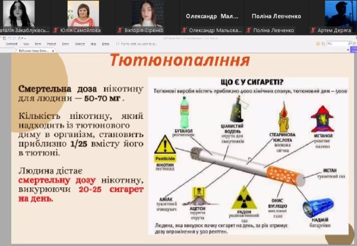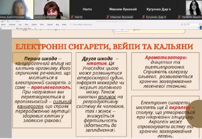 Захід відбувся за участю викладачки неврології, психіатрії та наркології Лебединського фахового медичного коледжу імені професора М. І. Сітенка Алєсі Бойченко. Досвідчена фахівчиня розповіла про причини, стадії розвитку алкогольної та наркотичної залежностей, їх наслідки для організму людини та її соціального життя. Окремо зупинилися на шкоді від електронних сигарет, вейпу та кальяну, оскільки, на жаль, ці популярні зараз вироби несуть приховані загрози.
