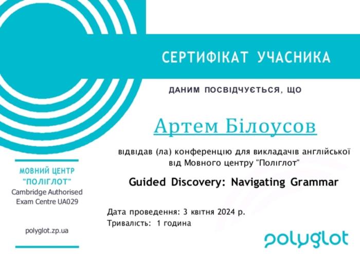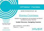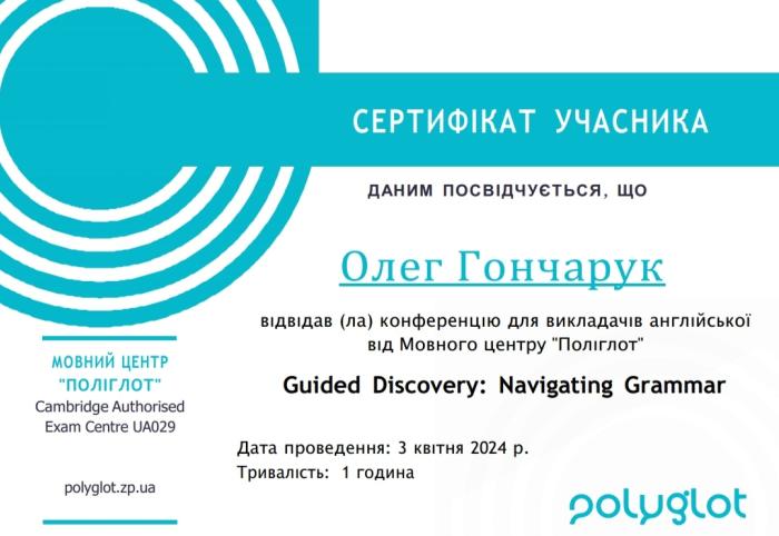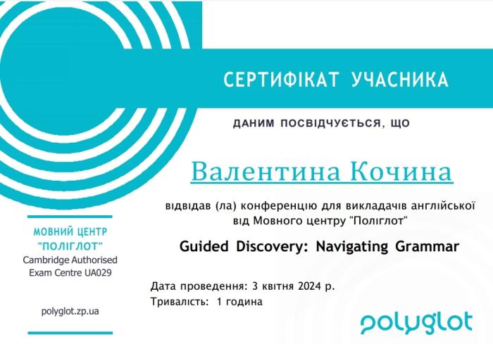 Завідувачка кафедри іноземних мов факультету № 4 ХНУВС Олена Статівка, доценти цієї ж кафедри Олег Гончарук, Валентина Кочина, Валентина Почуєва, старші викладачі Артем Білoусов і Лариса Сазанова відвідали конференцію «Guided Discovery: Navigating Grammar» для викладачів англійської від Мовного центру «Поліглот». Викладачі кафедри ознайомилася з методикою «керованого відкриття», яка ґрунтується на індуктивному підході до навчання. Спікери вебінару продемонстрували, як на основі даних, наданих викладачем, студенти самостійно формують правила граматики, або викладач пропонує приклади вирішення окремих завдань і допомагає студентам самостійно знайти загальний алгоритм їх розв'язання.