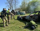 Викладачі кафедри тактичної та спеціальної фізичної підготовки факультету № 3 ХНУВС Сергій Кучинський, Володимир Євтушок, Сергій Тягай провели практичне бінарне заняття з курсантами факультету № 1. Своїм бойовим досвідом із майбутніми поліцейськими поділився військовослужбовець Збройних Сил України. Заняття пройшло на навчальному полігоні, де здобувачі освіти відпрацювали тактику дій на блокпосту: під час нападу та відбиття нападу диверсійної групи.