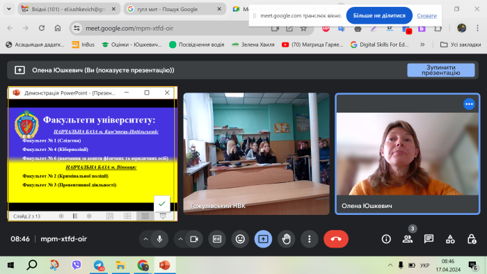 Доцентка кафедри теорії та історії держави і права факультету № 1 Олена Юшкевич провела зустріч зі школярами випускного класу Гожулівського навчально-виховний комплекс Полтавської міської ради щодо навчання в Харківському національному університеті внутрішніх справ.
