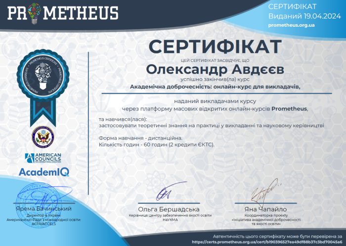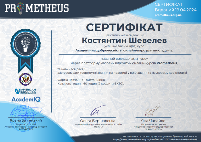 Науково-педагогічні працівники кафедри кримінального права і кримінології факультету № 1 на чолі із завідувачем кафедри, доктором юридичних наук, професором Юрієм Орловим пройшли онлайн-курс для викладачів з актуальних питань забезпечення академічної доброчесності в діяльності закладів вищої освіти на платформі Prometheus.
