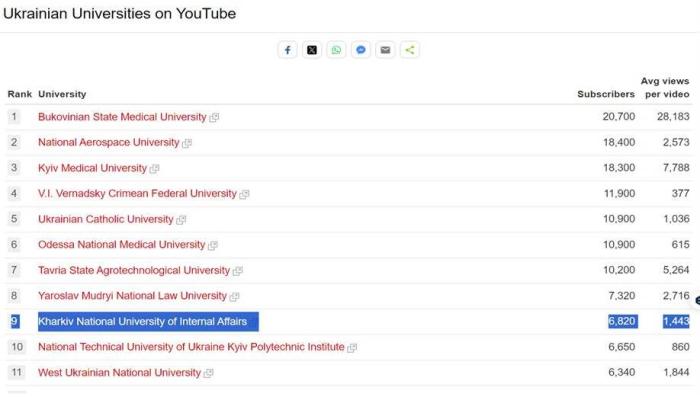 UniRank опублікував рейтинг найпопулярніших українських університетів на YouTube каналі (актуальність даних – квітень 2024 року). Найбільш популярні університетські YouTube канали визначалися за кількістю підписників і переглядів відео.