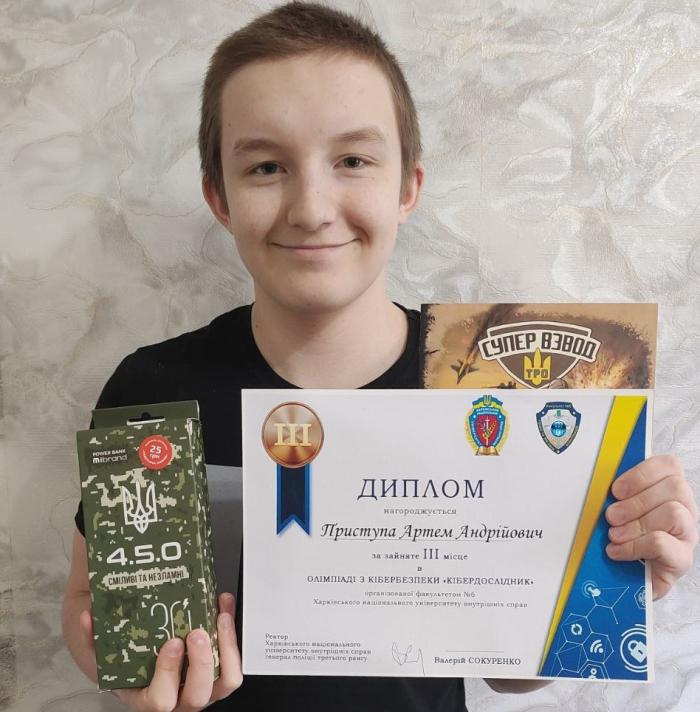 ІІІ місце – учень комунального закладу «Харківський ліцей № 128 Харківської міської ради» Артем Приступа (62 бали).