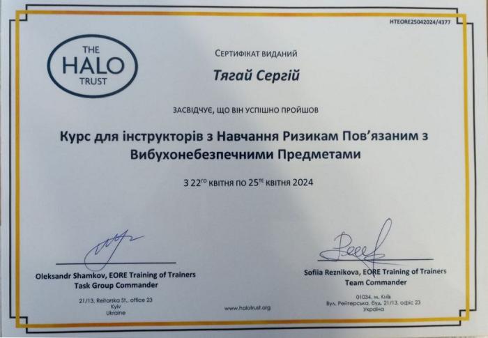 Після успішного складання іспиту працівники ХНУВС отримали сертифікати інструкторів, які дають можливість за міжнародними стандартами проводити навчання щодо ризиків від ВНП для цивільного населення. Отримані знання і навички будуть використані в освітньому процесі.