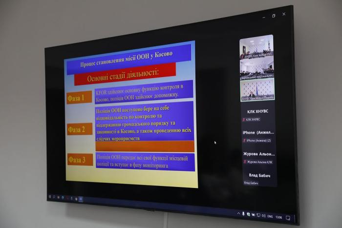 Валентина Почуєва з власного досвіду миротворчої діяльності розповіла здобувачам освіти про процес становлення місії ООН у Косово, а також її структуру та особливості, основні напрями роботи міжнародної цивільної поліції, історію діяльності українських миротворців. Вона зазначила, що українські миротворці з честю та гідністю несли нелегку службу в складі цивільної поліції ООН і встановлювали мир на Балканській землі. Спікерка звернула увагу на те, що отриманий українськими правоохоронцями досвід у міжнародних миротворчих місіях наразі допомагає їм ефективно реагувати на безпекові виклики в умовах воєнного стану.
