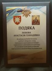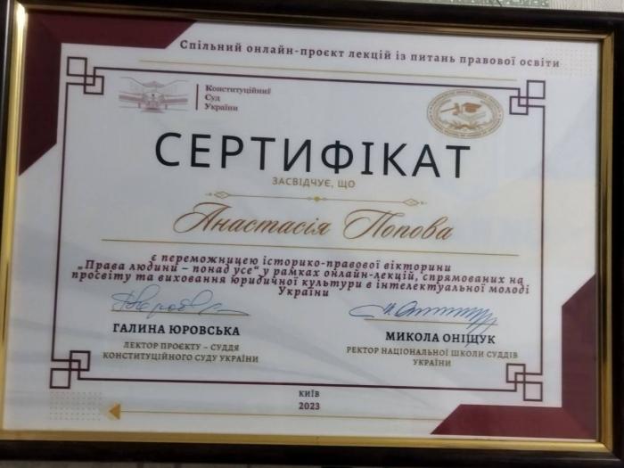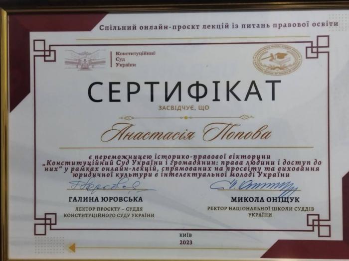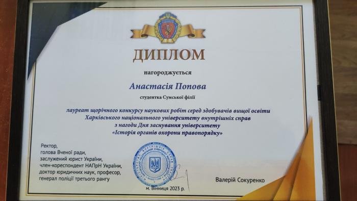 Першокурсниця Сумської філії ХНУВС Анастасія Попова займає активну позицію у громадському житті закладу вищої освіти: староста групи, членкиня школи наукового лідерства, учасниця курсу Модуля Жана Моне «Цифрова трансформація прав: досвід ЄС»; курсу від AICE Project Agents 2024 «Академічна доброчесність в європейському освітньому і науковому просторах: багатовимірна імерсивна модель». Анастасія є переможницею історико-правових вікторин від Конституційного Суду України та лауреаткою конкурсу наукових робіт серед здобувачів вищої освіти ХНУВС. Від початку російського повномасштабного вторгнення в Україну Анастасія Попова активно бере участь у волонтерській діяльності та долучається до різних громадських ініціатив на Харківщині.