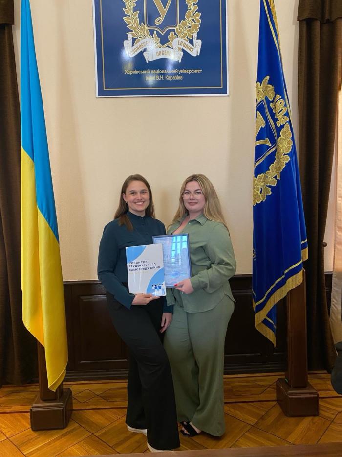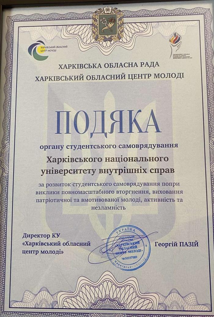 Харківський обласний центр молоді організував і провів панельну дискусію для органів студентського самоврядування закладів вищої освіти Харківської області, в якому взяли участь представники студентського самоврядування Харківського національного університету внутрішніх справ – голова студентської ради факультету № 6 Наталя Василенко та її заступниця Каріна Гаєвська. За розвиток студентського самоврядування попри виклики повномасштабного вторгнення, виховання патріотичної та вмотивованої молоді, активність та незламність студентки ХНУВС були відзначені подякою директора Харківського обласного центру молоді Георгія Пазія.