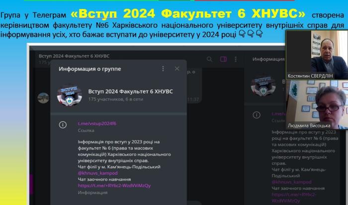 Заступник декана факультету № 6 Костянтин Свердлін за сприяння керівників Департаментів освіти Хмельницької ОДА та Хмельницької міської ради провів онлайн-зустріч щодо вступної кампанії 2024 року з керівництвом і старшокласниками низки закладів загальної середньої освіти Хмельницької області.