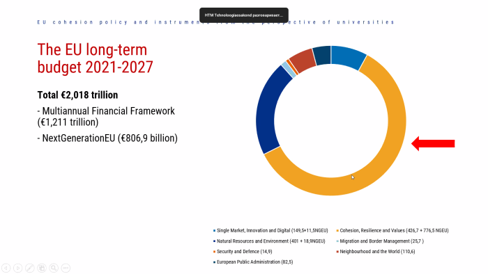 Захід відбувся в межах проєкту «Сходи до досконалості: посилення ефективної та надійної системи вищої освіти в Україні» (UKRKORG). Учасників тренінгу привітала експертка Національного агентства із забезпечення якості вищої освіти (НАЗЯВО) України Стела Шаповал. Вона представила основну спікерку заходу – експертку Ради з питань освіти та молоді Естонської Республіки (HARNO) Улле Мюст (Ülle Must), яка детально розповіла про сутність та мету регіональної політики згуртованості Європейського Союзу – підтримка пріоритетів політики ЄС. Улле Мюст висвітлила п’ять політичних цілей політики згуртування, спрямованих на вирішення транскордонних проблем і спільний розвиток потенціалу різних територій. Учасники ознайомилися з європейськими структурними та інвестиційними фондами (ESIF), дізналися про напрями освіти та досліджень, систему бюджетування, принципи розподілу бюджету серед країн членів ЄС, зокрема за період з 2014 по 2020 роки за різними напрямами на прикладі Естонії.