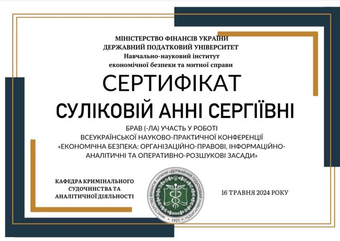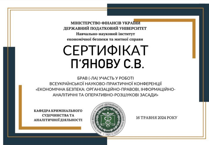 На секції «Економічна безпека як складова національної безпеки держави» Анна Сушкова та Сергій П’янов представили доповіді: «Інвестиційна привабливість Україна в умовах воєнного стану як складова економічної безпеки та стабільності держави» та «Еволюція інститутів спільного інвестування в Україні: шлях у 30 років від обслуговування процесів великої приватизації до використання у схемах з оптимізації оподаткування».