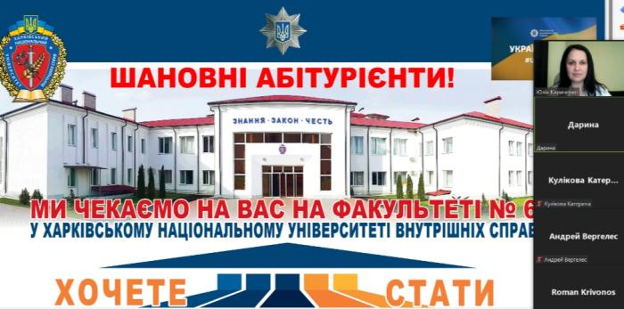 Професорка кафедри правового забезпечення підприємницької діяльності та фінансової безпеки факультету № 6 Юлія Кириченко провела профорієнтаційну онлайн-зустріч із учнями 10-11 класів Безлюдівського ліцею Безлюдівської селищної ради. Вона розповіла школярам про історію та досягнення Харківського національного університету внутрішніх справ, його структуру, особливості вступної кампанії 2024 року та підготовки студентів і слухачів за різними спеціальностями і формами навчання на факультеті № 6.