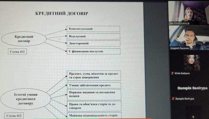 Доцентка кафедри цивільного права та процесу Елла Твердохліб та адвокат Андрій Лисенко провели бінарне заняття для студентів 3 курсу денної форми навчання факультету № 6 ХНУВС за темою «Договори про надання фінансових послуг. Кредитний договір». Адвокат ознайомив студентів із актуальними тенденціями розвитку кредитних правовідносин в Україні, звернув увагу на ризики та проблеми, які виникають під час виконання кредитних зобов’язань, та дав практичні рекомендації щодо складання кредитного договору.