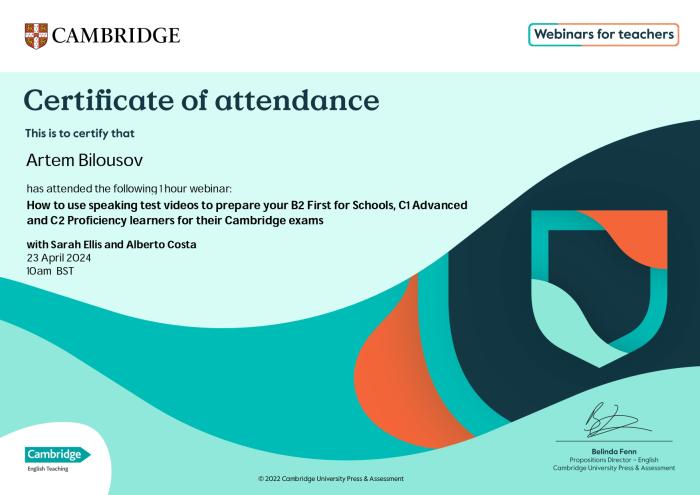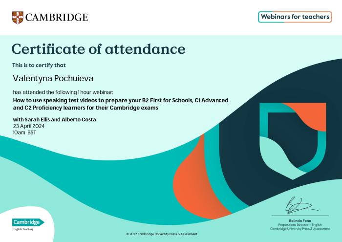 Завідувачка кафедри іноземних мов факультету № 4 ХНУВС Олена Статівка, доценти цієї ж кафедри Олег Гончарук, Валентина Кочина, Валентина Почуєва, старші викладачі Артем Білoусов та Лариса Сазанова взяли участь у міжнародному онлайн-вебінарі «How to use speaking test videos to prepare your B2 First for Schools, C1 Advanced and C2 Proficiency learners for their Cambridge exams», організованому Cambridge University Press & Assessment. Спікери Метью Еллман та Клер Росс розповіли про підготовку до складання іспиту із використанням тестових відеороликів, запропонованих Cambridge English Teaching.