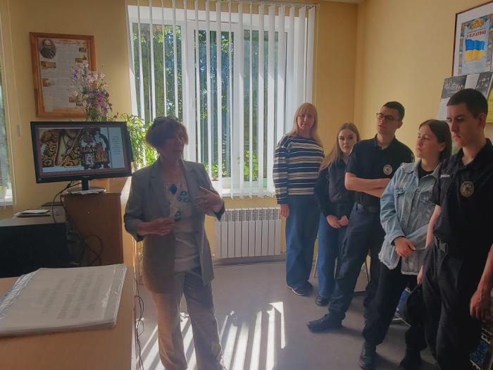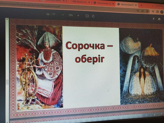 Старша викладачка кафедри іноземних мов факультету № 4 Харківського національного університету внутрішніх справ Лариса Сазанова провела у науковій бібліотеці університету кураторську бесіду на тему «Вишиванка – оберіг кожного українця» для курсантів другого курсу. Йшлося про збереження давніх народних традицій створення, носіння етнічного вишитого українського одягу та історію виникнення свята. Бібліотекарки Жанна Лазоренко та Олена Совінська запропонували ознайомитися з презентацією «Вишиванка – генетичний код нації», з якої курсанти дізналися, що закодовано в орнаменті та чому вишиванка є оберегом від усього лихого. Наприкінці заходу було проведено вікторину.