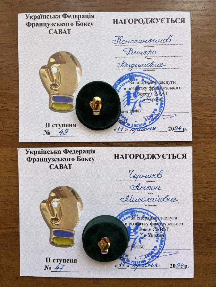 Спортсменів підготували – старший викладач Дмитро Константинов і викладач Антон Черніков. Вони були нагороджені відзнаками за спортивні заслуги у розвитку французького боксу САВАТ в Україні.