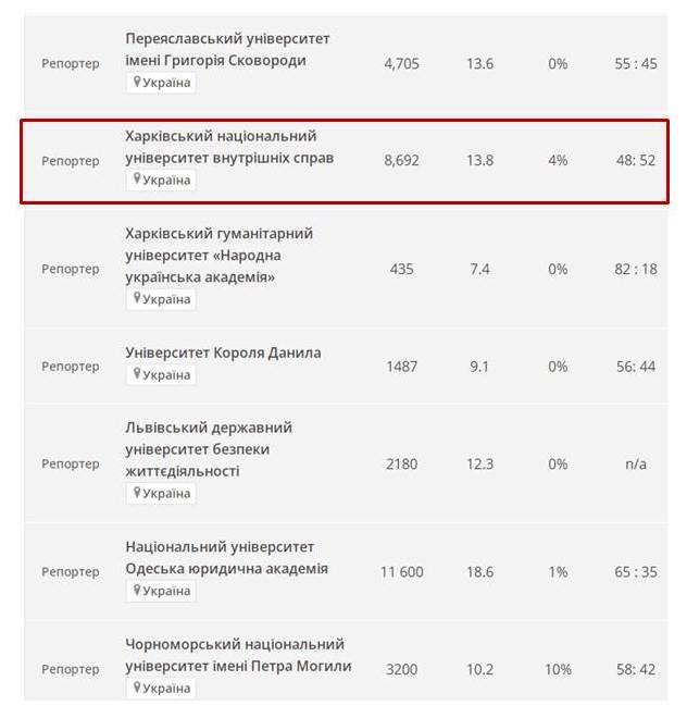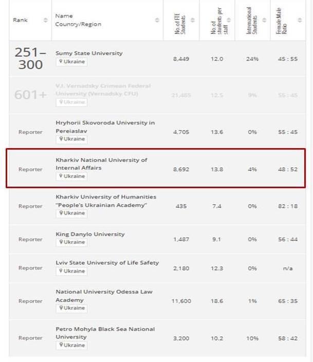 Серед 673 університетів світу, які увійшли до рейтингу, включено два українських, а з 499 закладів, які мають статус «репортера», – сім українських. Харківський національний університет внутрішніх справ – єдиний серед ЗВО МВС України, що готують поліцейських, – отримав у рейтингу статус «Репортер».