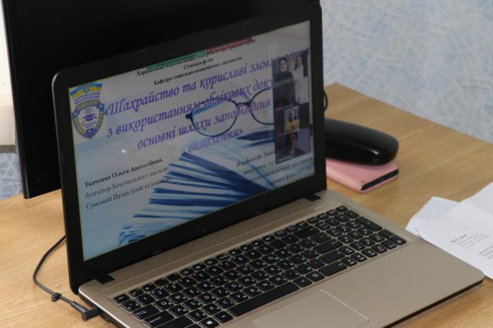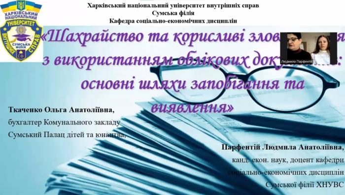 Доцентка кафедри соціально-економічних дисциплін Сумської філії ХНУВС Людмила Парфентій спільно з бухгалтером Комунального закладу Сумського Палацу дітей та юнацтва Ольгою Ткаченко в режимі відеоконференції провели заняття для студентів 2 курсу спеціальності «Право» на тему «Шахрайство та корисливі зловживання з використанням облікових документів: основні шляхи запобігання та виявлення».