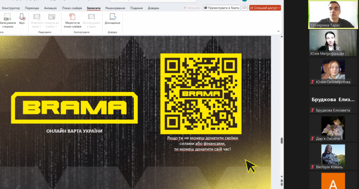 Тарас Мочернюк розповів студентам про свою професійну діяльність. Особливу увагу він приділив протистоянню в умовах війни шахраям і хакерам, зазначив основні напрями роботи протидії, типові види шахрайства та основи кібергігієни. Доповідач також розповів про проєкт «BRAMA». Брама – це портал, віртуальні ворота, які захищають нас від небезпеки та негативного впливу. Мета порталу – перекриття доступу до нашого інфопростору російським осередкам пропаганди онлайн та популяризація безпечного поводження в мережі.