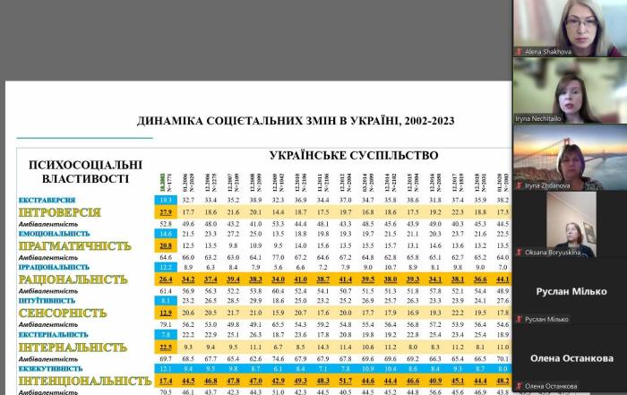 Професорка кафедри соціології та психології, докторка соціологічних наук Ірина Нечитайло виступила із доповіддю «Соціально-психологічні характеристики сучасного українського суспільства», зробивши особливий акцент на аналізі динаміки соцієтальних змін в Україні.
