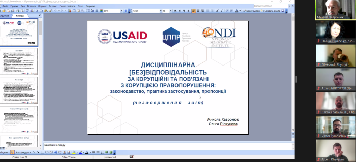 Спікер – член правління, директор з наукового розвитку Центру політико-правових реформ, доктор юридичних наук, професор Микола Хавронюк презентував результати дослідження законодавства і практики притягнення до дисциплінарної відповідальності за корупційні та пов’язані з корупцією правопорушення. Після цього відбулась модерована експертна дискусія, наприкінці якої було підбито її підсумки.