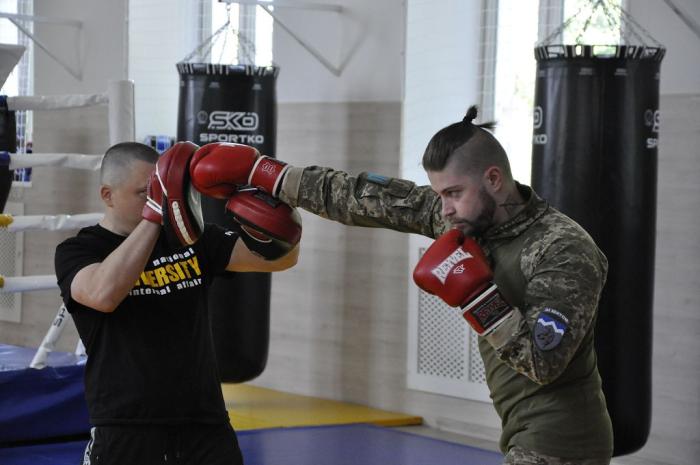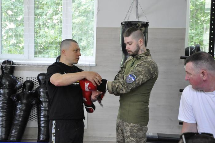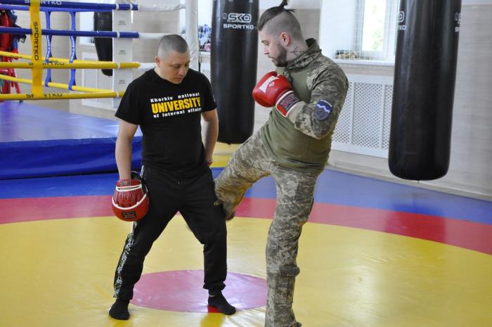 Відпрацювання елементів кікбоксингу відбулися на другому етапі. Учасник бойових дій, слухач Автошколи для осіб з інвалідністю ХНУВС Яромир Сливка разом із заслуженим майстром спорту України з таїландського боксу, суддею міжнародної категорії з таїландського боксу Богданом Лукіним продемонстрували боксерські навички – удари по лапах з елементами боксу та кікбоксингу.