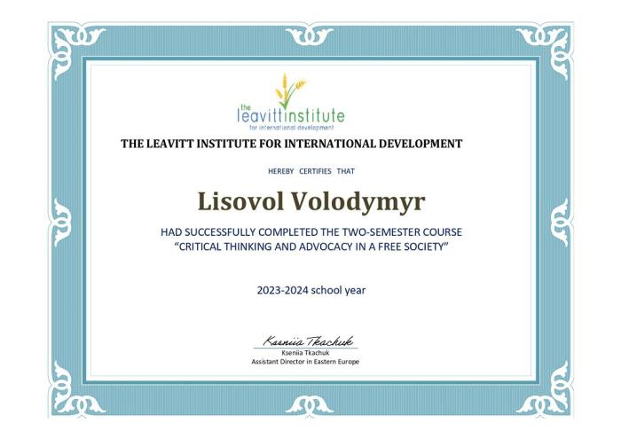 Курсант другого курсу факультету № 4 Харківського національного університету внутрішніх справ, член наукового гуртка кафедри іноземних мов цього ж факультету Володимир Лісовол успішно пройшов курс Левіт Інституту міжнародного розвитку (The Leavitt Institute for international development – TLI) «Критичне мислення та адвокатура як основа вільного суспільства».