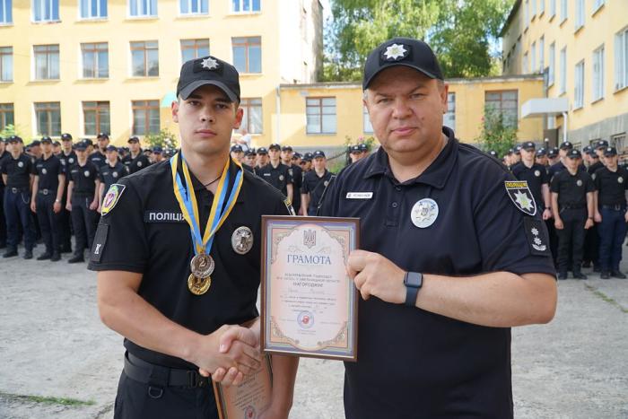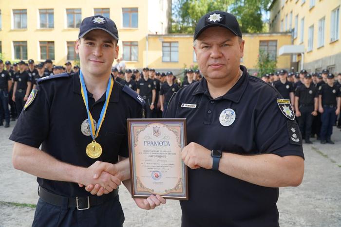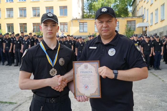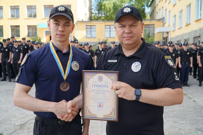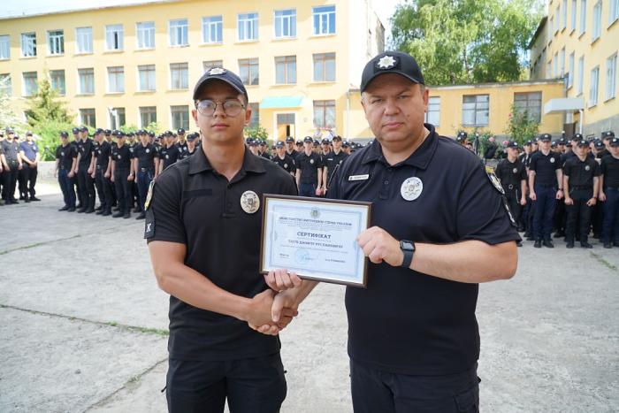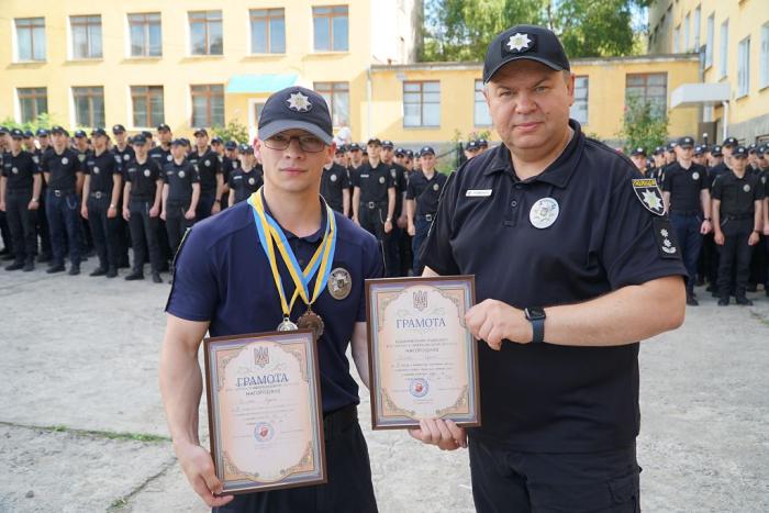Під час шикування особового складу факультету № 1 ХНУВС декан Віталій Романюк привітав курсантів, які стали учасниками ІІ туру Конкурсу наукових робіт здобувачів першого (бакалаврського) рівня вищої освіти ЗВО, що належать до сфери управління Міністерства внутрішніх справ України. Сертифікати отримали Альона Мусійко та Данило Тесла.